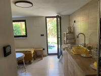 - kuchyňská linka v plném vybavení: pečící trouba, mikrovlnná trouba, varná deska, kávovar, velká lednice s mrazákem, nádobí, hrnce, příbory