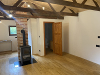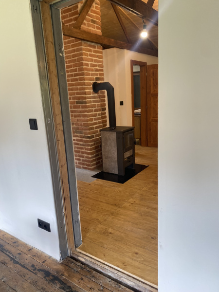 Vytápění je řešeno podlahovým topením a krbovými kamny.