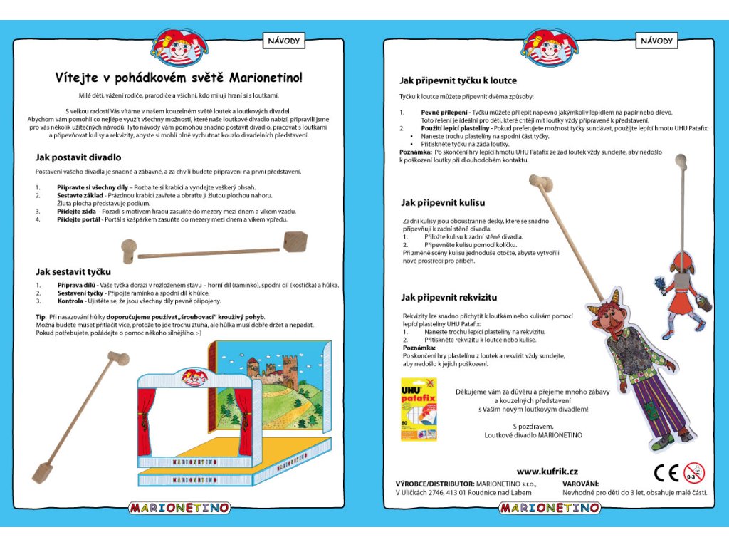 Loutkové divadlo je skládací a snadno přenosné. Pevná krabice a laminovaný karton zajišťují lehkost, pevnost a odolnost proti oděru. Perfektní na cesty, navíc slouží jako úložný box. Návod k divadlu naleznete ZDE.