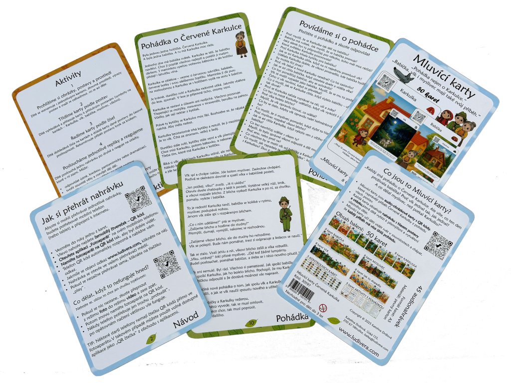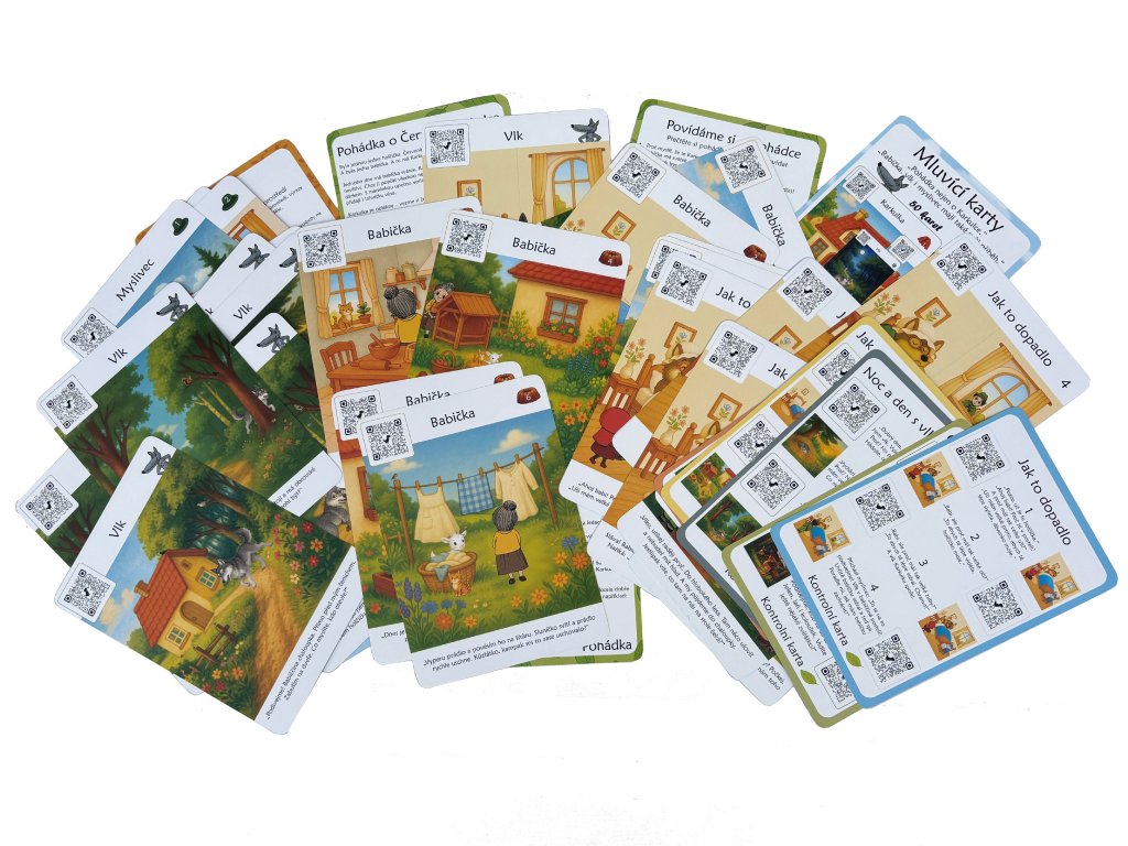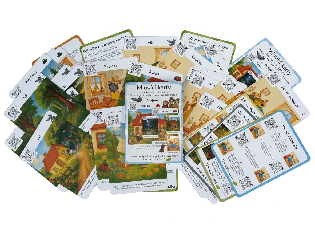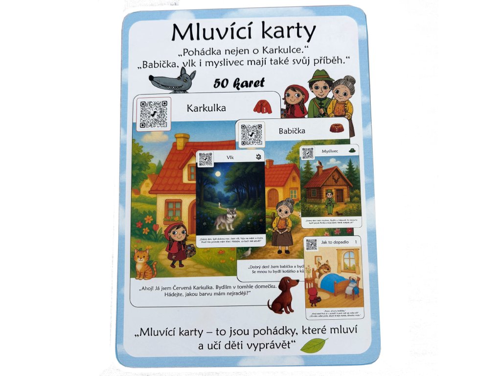 Mluvící karty jsou vyprávěcí karty s dějovými sekvencemi a zvukovými nahrávkami, které rozvíjejí řeč, představivost a porozumění příběhu skrze různé pohledy na známou pohádku. Mluvící karty rozvíjejí schopnost vidět situace z různých pohledů, představivost, slovní zásobu a vyjadřování, reakci a dialog. Mluvící karty představují kompletní interaktivní sadu, která propojuje poslech, vyprávění, představivost a hru.