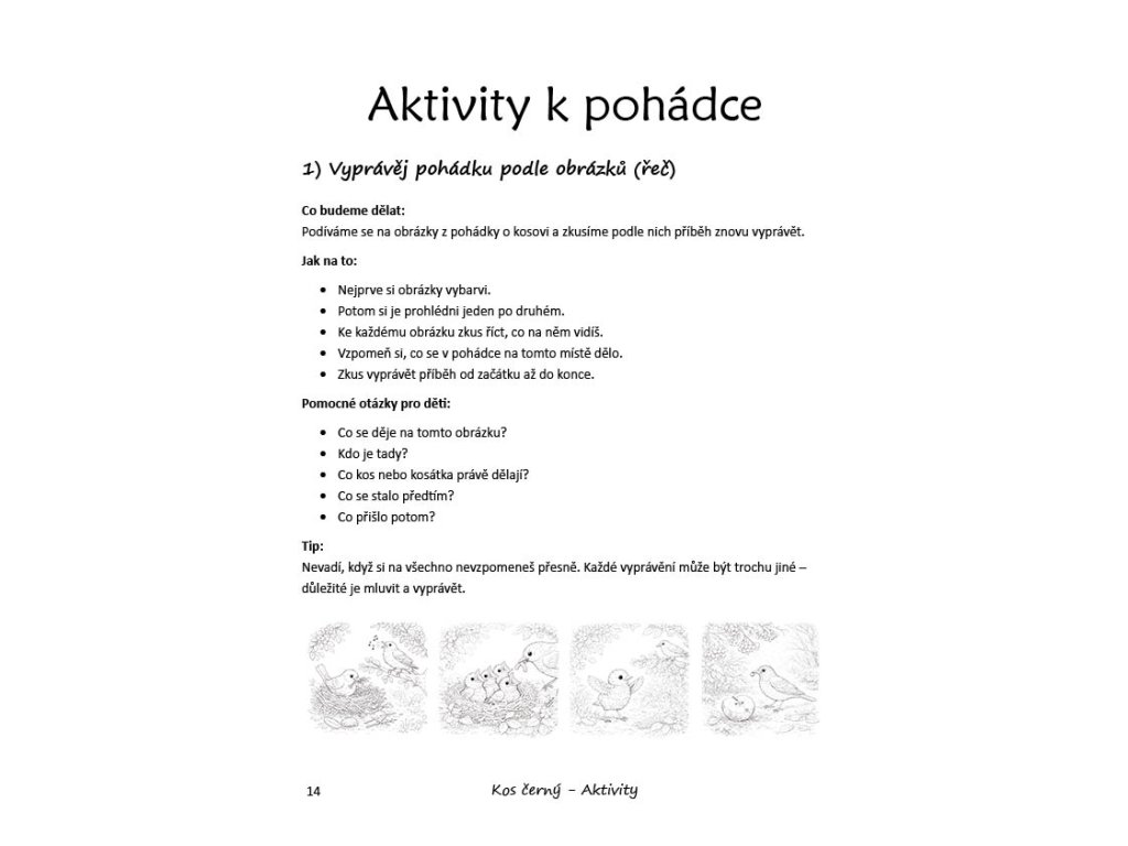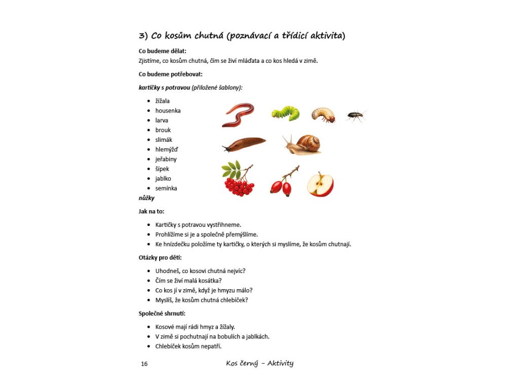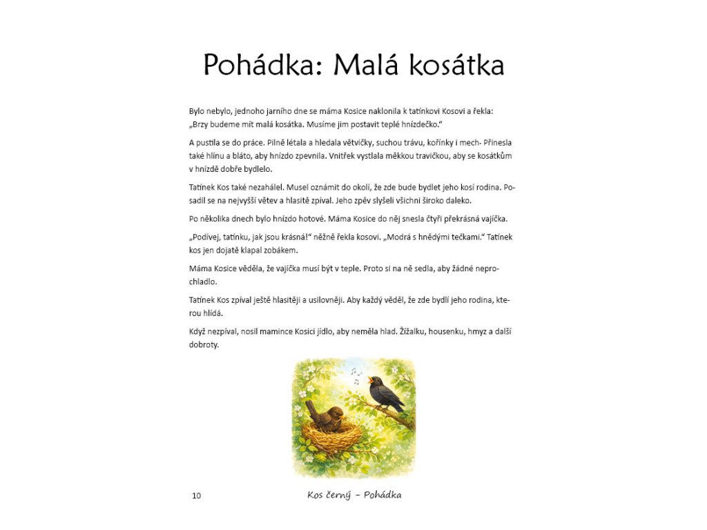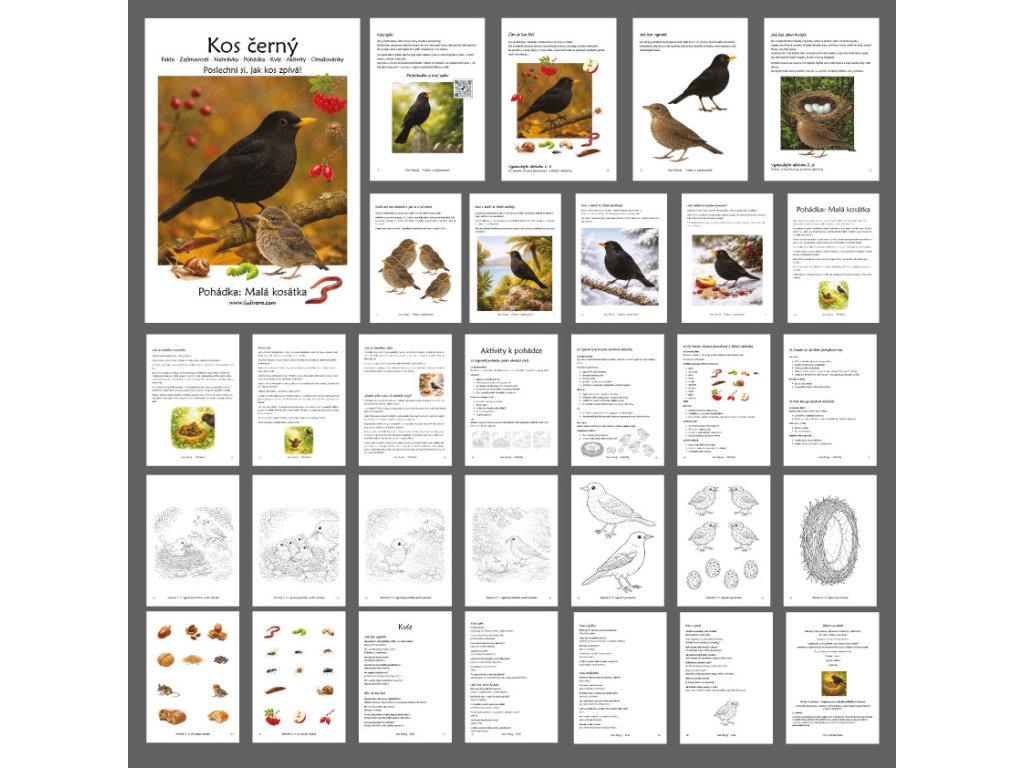 Součástí je pohádka Malá kosátka, zajímavosti ze života kosa, poslech jeho zpěvu, kvíz, tvořivé a pohybové aktivity i omalovánky. Materiál podporuje pozorování přírody, rozvoj řeči, myšlení a vztahu k okolnímu světu.